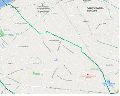 Passés la voie ferrée, nous tournons à droite par le chaussidoux de la rue de l'Ouche Quinet. Assez tranquille. Au rond-point encore à droite par la rue des Garennes, puis tout de suite à gauche par la rue des Fresches. Heureusement, il y a quelques panneaux qui indiquent la direction cyclable, mais un peu plus de marquage serait souhaitable. Là, nous sommes à l’intérieur d’un quartier par un cheminement doux, et c’est très tranquille, les trottoirs ont été abaissés pour un meilleur confort à vélo, ce qui n'était pas le cas il y a 15 ans. Merci à nos amis de "Nos Rues Demain" de St Sébastien, ils n’y sont sans doute pas pour rien. On poursuit par des allées, Jean Monnet, Charles Lindbergh, rue Costes et Bellonte, puis à droite rue du bois des Michées, et c’est tout droit rue de la Croix Sourdeau qui nous mène au Bd des Pas Enchantés sur quelques mètres, avant d’emprunter la nouvelle piste sécurisée sur le pont Sédar-Senghor.