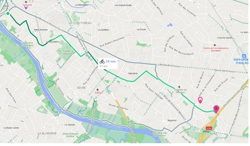 Et voici ce que pourrait donner un itinéraire sécurisé et non stressant pour rejoindre Pirmil à partir de la passerelle piétonne (rue du 1er mai - Stade Raymond Durand), si elle est rendue un jour cyclable… C’est 300m et 2mn de plus que par la route de Clisson, mais tellement plus cool, sécurisé, et avec très peu de circulation automobile !!!