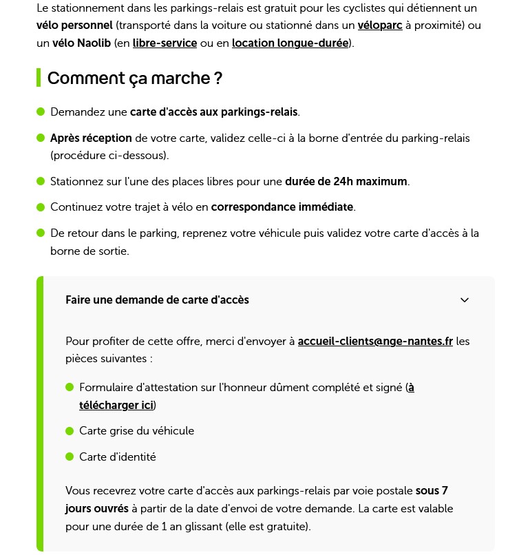 Enfin, une autre possibilité très peu connue, le stationnement est aussi gratuit pour les voitures dont les conducteurs viennent avec le vélo dans la voiture et continuent en vélo vers Nantes. Il faut faire une demande à NGE avec votre carte grise du véhicule et votre carte d'identité. Vous aurez alors une carte d'accès au parking relais.